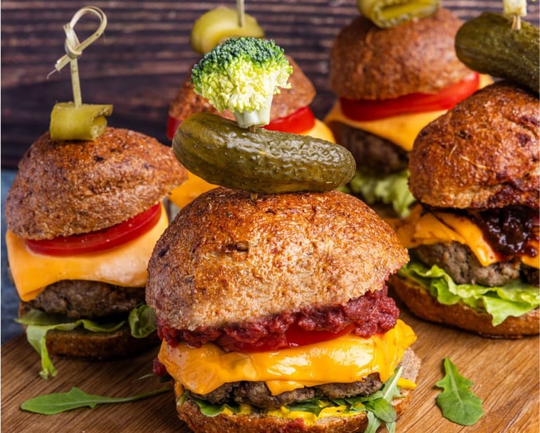 For example, in the the 'naturally better burger' (shown right) we incorporated our vegetable-ingredients at an inclusion rate of 20% into a meat burger patty without disrupting the look, taste and mouthfeel. We also supplemented the sauce and the bread. Other examples of development of 'hybrid' products using our ingredients include beef+bean+broccoli burgers (the "Triple B") and sausage rolls. While we love working to "hybridize" meat products as part of "improve rather than remove", our vegan ingredients can also be used in vegetarian products such as pasta and sauces (such as shown above).